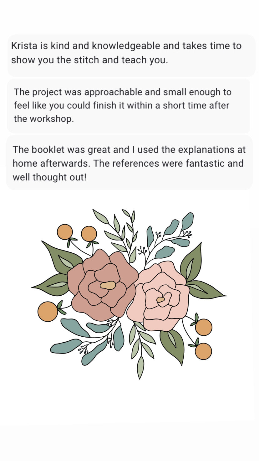 By the end of the workshop, you'll feel confident in your new skills and ready to take on solo projects. Plus, you'll have a chance to pick up your next project, ask questions and connect with other local embroidery enthusiasts in a fun and welcoming atmosphere.