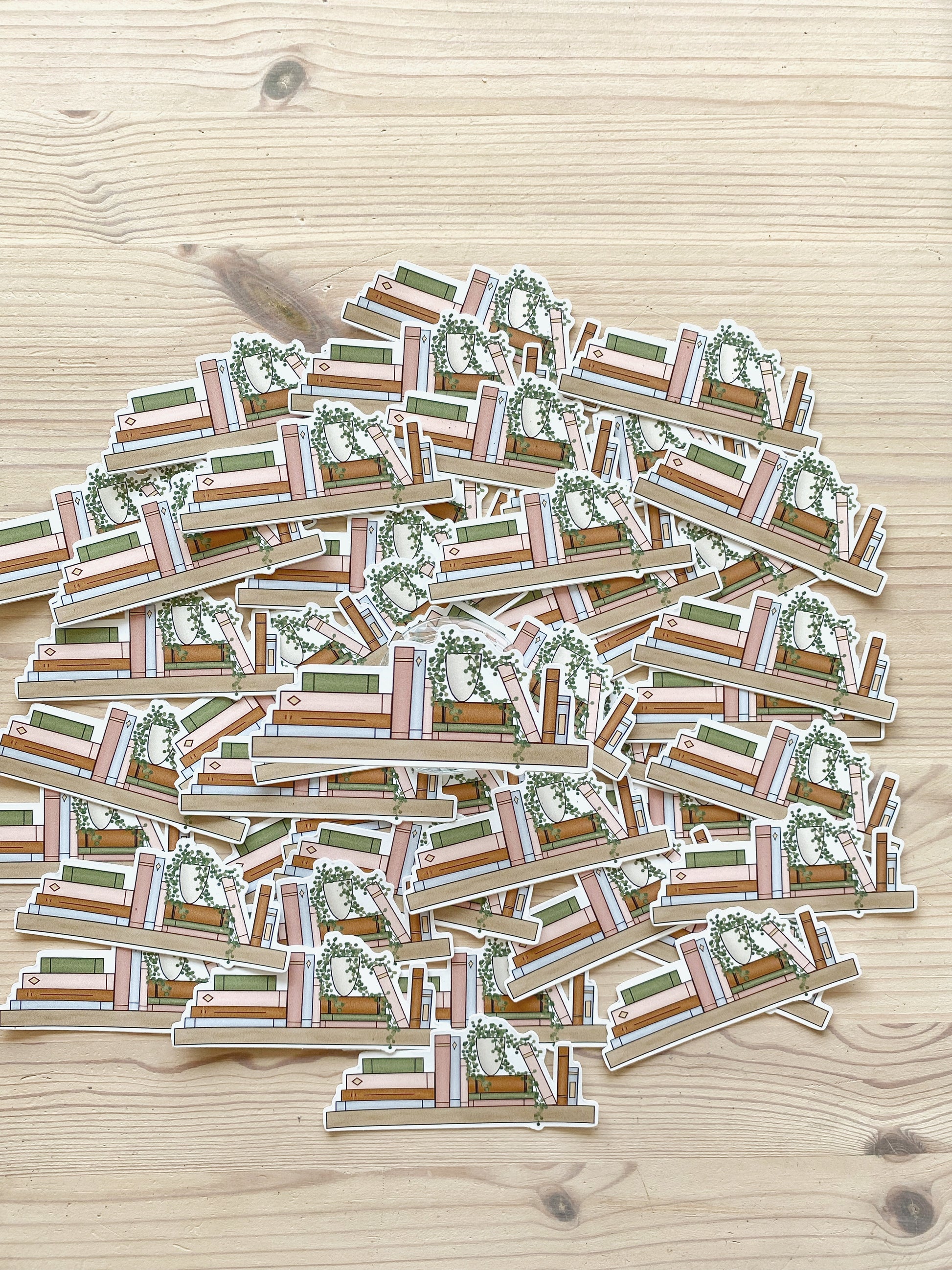 Inspired by one of Homebody Handmade's original embroidery hoops, this sticker features an intricately designed bookshelf adorned with matching books and a delightful potted plant. The soft and muted colours lend an air of tranquility, making it a captivating addition to any surface.